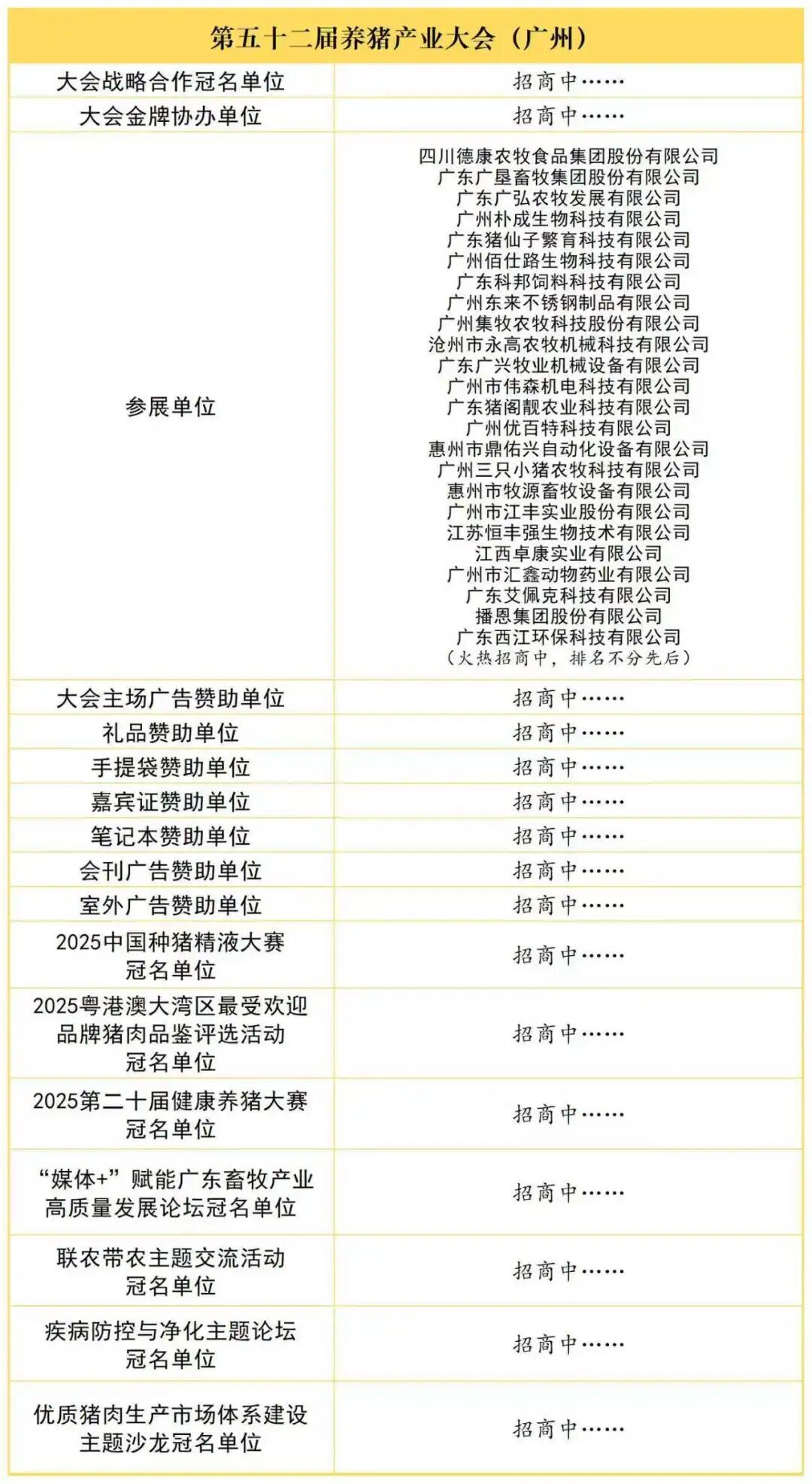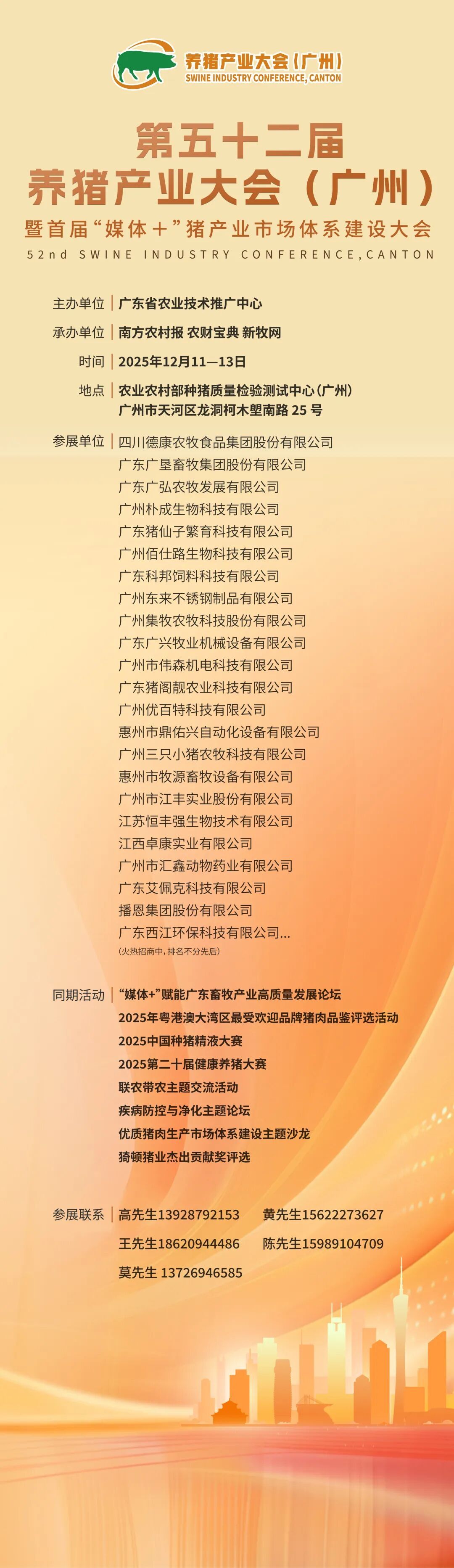 2025年12月11-13日,第五十二届养猪产业大会(广州)将于广州柯木塱农业农村部种猪质料老师测试中心雄伟召开。